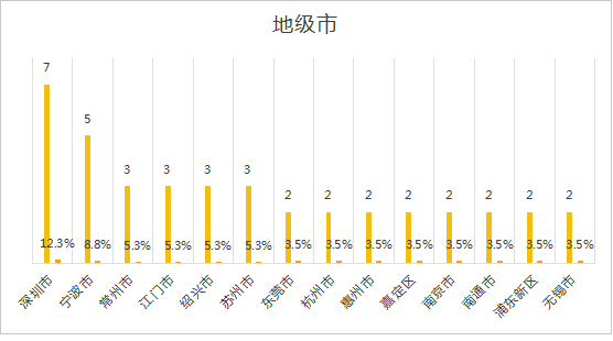 从地级市看,深圳有7家,占比12.3%;宁波有5家,占比8.8%;常州、江门、绍兴、苏州、东莞、杭州、惠州、南京、南通、无锡等地各有3家。