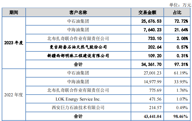 2021年—2023年,公司对中石油集团下属企业、中海油集团下属企业的各期主营业务收入占比在90%以上。前五大客户收入占主营业务收入的比例分别为97.78%、98.46%和97.31%。