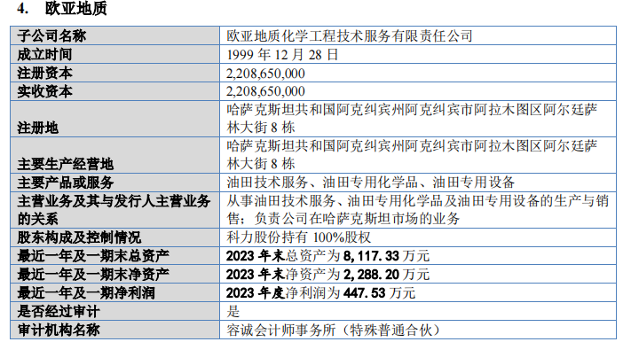虽然近四成的收入来自海外,但科力股份两家境外子公司欧亚地质、加拿大科力的盈利却较低甚至亏损。数据显示,2022年及2023年,欧亚地质净利润分别为-494.39万元、447.53万元,加拿大科力净利润分别为869.11万元、279.09万元。