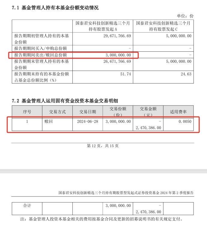分析发现,国泰君安资管以固有资金持有该基金。二季度,国泰君安资管赎回300万份该基金,交易金额达247.04万元。本次赎回后,国泰君安资管及其高管、基金经理合计持有该基金3620.55万份,占基金总份额的50.39%。