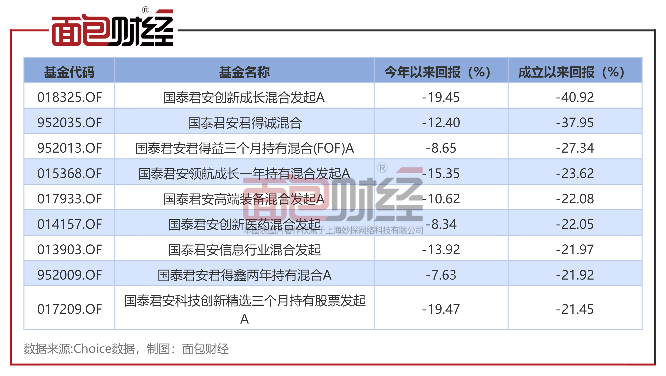 根据不完全统计,截至2024年8月12日(下同),国泰君安资管在管的9只公募产品(初始基金口径)成立以来净值累计下跌超过20%。