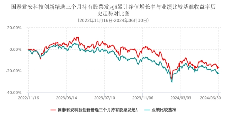 国泰君安科技创新精选三个月持有股票发起成立于2022年11月,基金投资目标为:本基金主要投资于科技创新相关主题的股票,把握中国创新驱动发展的投资机遇,在严格控制风险的前提下,力争实现基金资产的长期稳定增值。基金业绩比较基准为:中国战略新兴产业综合指数收益率*90%+中债新综合财富(总值)指数收益率*10%。