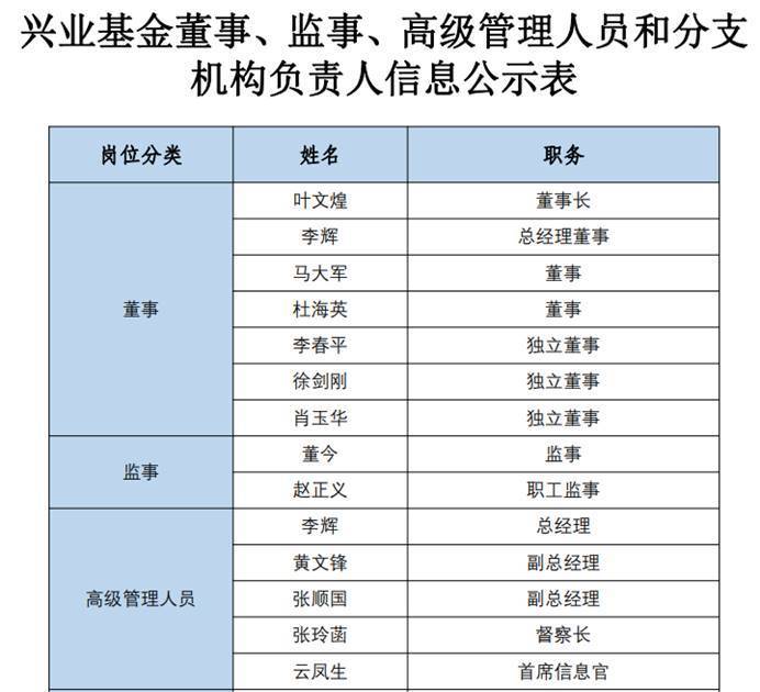 公开披露的信息显示,兴业基金成立于2013年4月17日,是兴业银行控股的全国性基金管理公司。公司董事长为叶文煌、总经理为李辉、督察长为张玲菡。