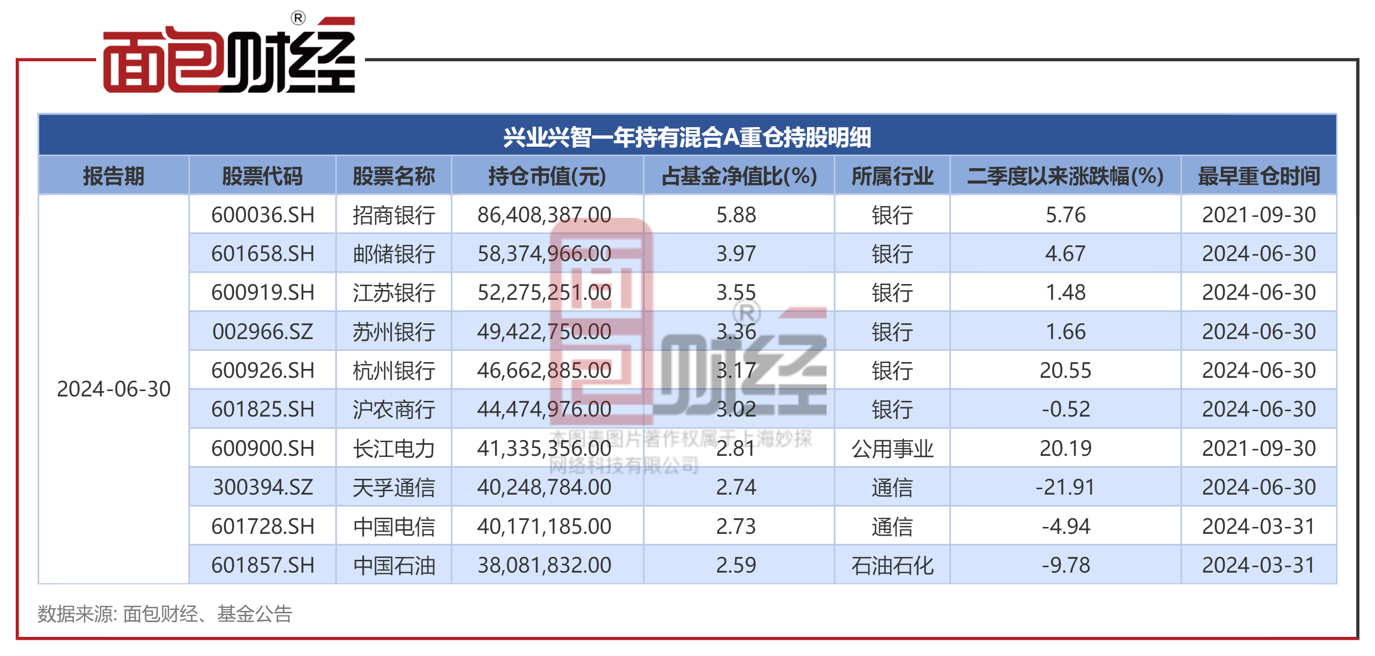 该基金二季度末重仓股包括招商银行、邮储银行、江苏银行、苏州银行、杭州银行、沪农商行、长江电力、天孚通信、中国电信、中国石油。