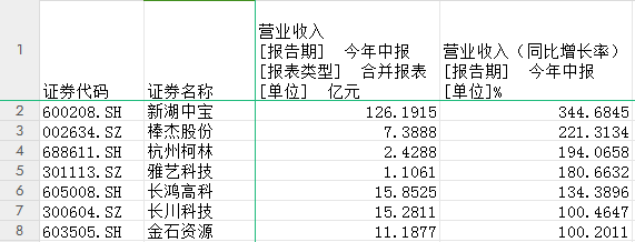 从营业收入同比增速看,新湖中宝、棒杰股份、杭州柯林、雅艺科技、长鸿高科、长川科技、金石资源7家公司表现亮眼,同比增速均超过100%。其中,新湖中宝上半年营业收入126.19亿元,同比增长344.68%;棒杰股份上半年营业收入7.39亿元,同比增长221.31%。
