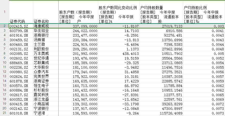 其中,海康威视以33.71万户的数量遥遥领先,其也是上半年浙股总市值最高的公司,到达2884亿元。相比之下,总市值位居第二的宁波银行,股东户数不到14万。