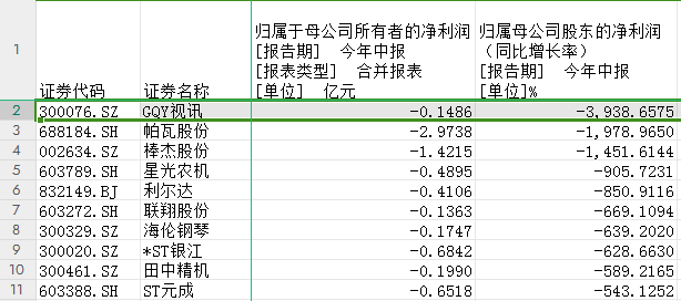 上半年,浙江96家亏损企业中,位居归母净利润下降前10名的分别是GQY视讯、帕瓦股份、棒杰股份、星光农机、利尔达、联翔股份、海伦钢琴、*ST银江、田中精机、ST元成。