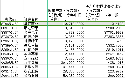 上半年,5家公司股东户数分别为10710户、19616户、4787户、3286户、3170户,同比变动比例分别高达214100%、115288.24%、39791.67%、27283.33%、15750%。