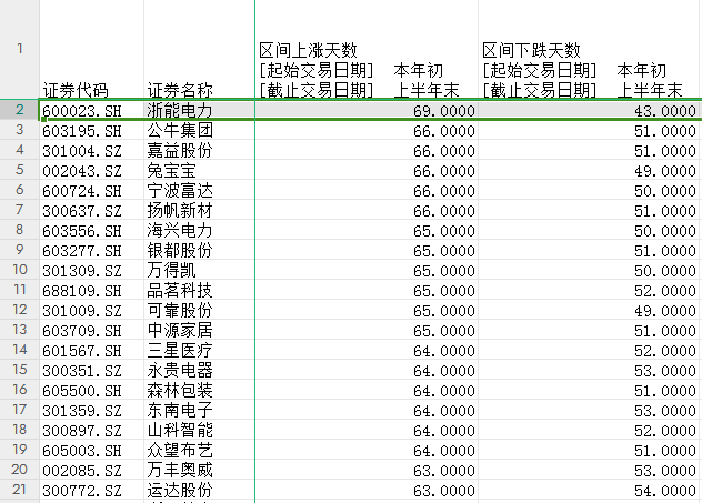 今年上半年共计117个交易日,上涨天数超过60天的上市公司一共有69家。其中,浙能电力69个交易日上涨,嘉益股份、公牛集团、宁波富达、兔宝宝、扬帆新材5家公司各有66个交易日上涨。