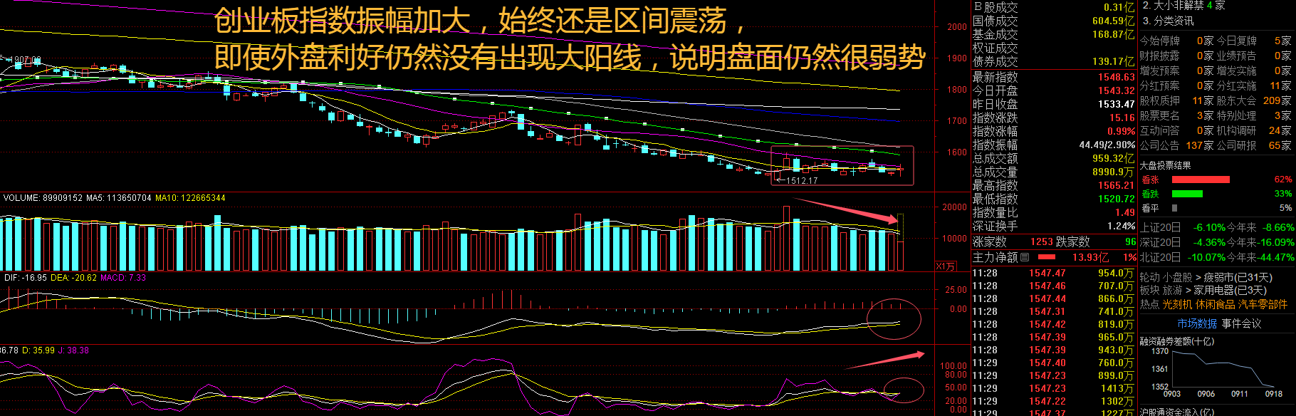 创业板指数周四盘中从跌近1%,到涨逾2%,也出现了明显的V型,到A型的走势,市场振幅很大,也说明场内资金对于反弹的分歧很大,买卖盘都很大!A 股市场具备较多偏底部特征:以自由流通市值计算的A 股换手率处于1.5%左右的历史偏底部水平;估值层面,沪深300 股息率相比10 年期国债利率超出1.1 个百分点,沪深300 指数前向估值处于历史底部一倍标准差附近,市场具备较好的估值吸引力;强势股补跌也往往是历史阶段性底部的常见现象。接下来注意创业板指数能否在1550点之上稳住。