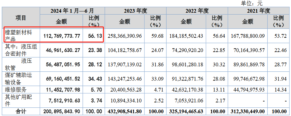 科隆新材的橡塑新材料产品主要应用于煤机领域,其需求主要受煤炭产量、煤机设备更新换代等因素影响,具体需求可分为新机装备和旧机维修。2021年、2022年、2023年、2024年上半年,公司的橡塑新材料产品销售收入分别为16778.88万元、18418.55万元、25836.64万元和11276.98万元。可以看出,今年上半年该产品的销售收入已出现下滑迹象。
