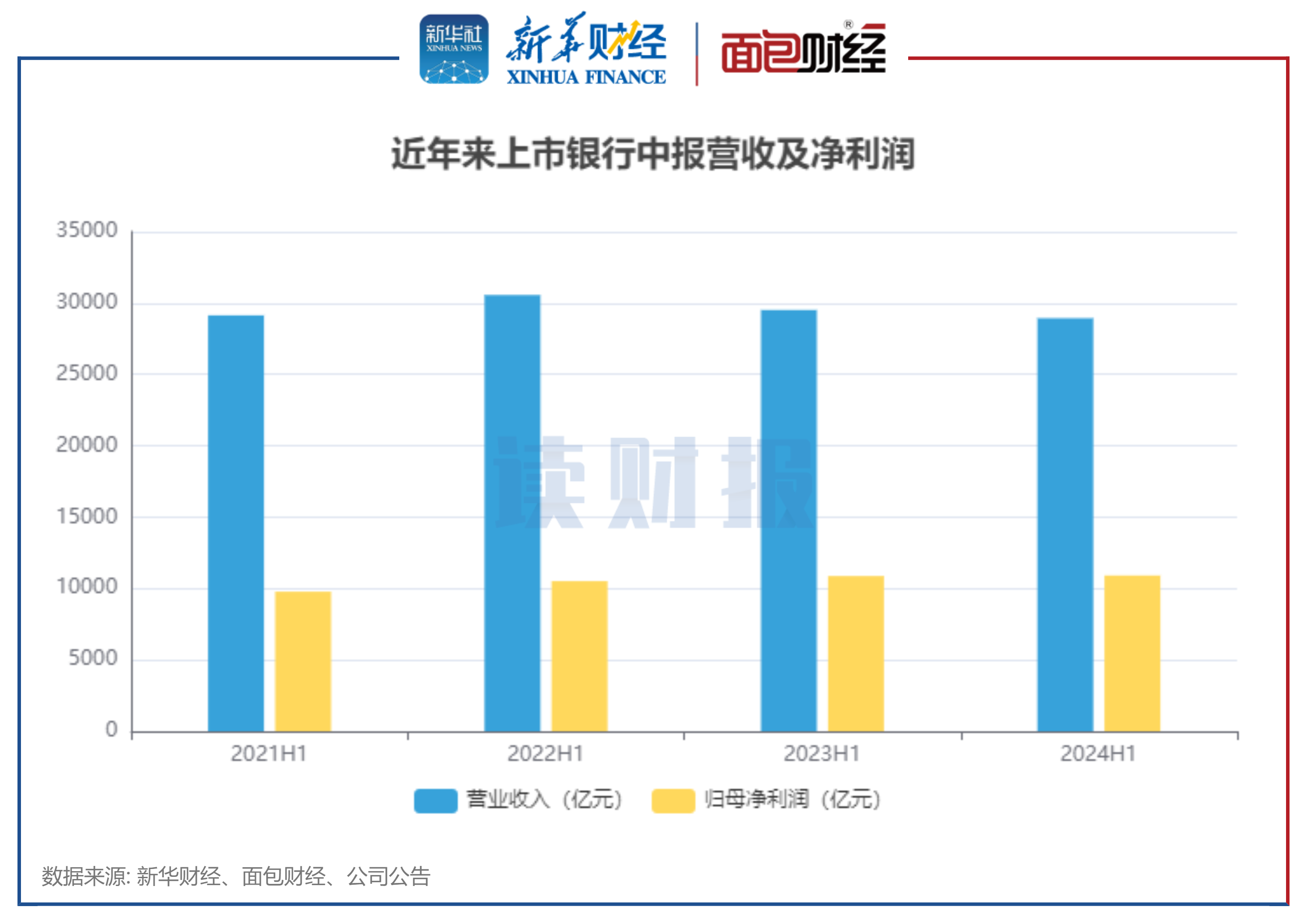 数据显示,2024上半年42家上市银行合计实现营收2.89万亿元,同比下降1.9%;实现归母净利润1.09万亿元,同比增长0.37%。