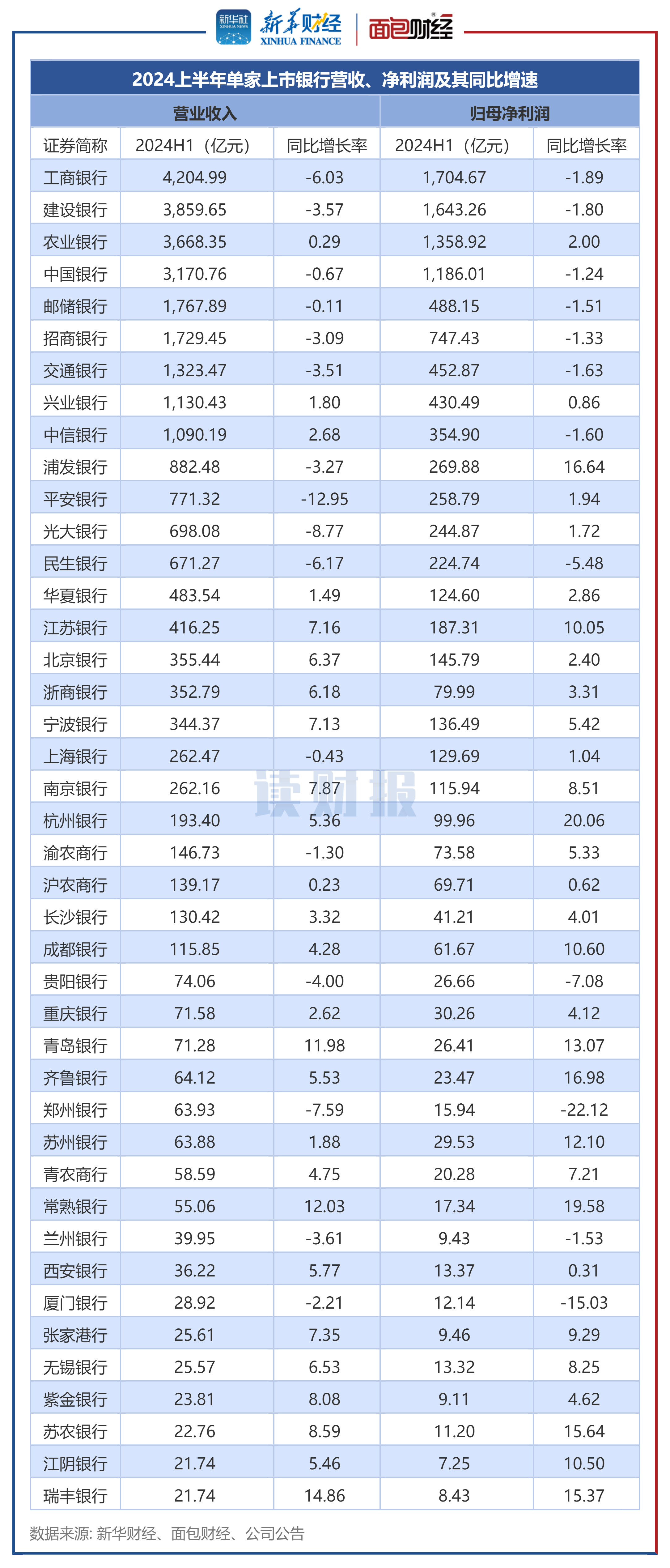 随着2024年中报收官,新华财经及面包财经研究员对A股42家上市银行业绩及核心监管指标进行了整理。