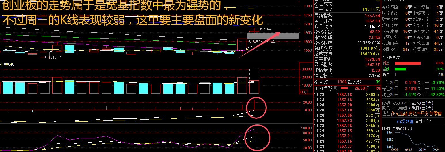 创业板指数周三高开后一度拉升4%,出现了明显的反弹行情,两天振幅近10%,这样的盘面确实不多见。随着国内宏观调控预期增强、稳增长政策持续落地推进,市场有望逐步企稳,未来股指总体预计将保持震荡格局,同时仍需密切关注政策面、资金面以及外部因素的变化情况。随着国庆节的到来,之后反弹力度将会减弱,市场分歧也将会逐步加大了。接下来注意创业板指数能否在1660点之上稳住。