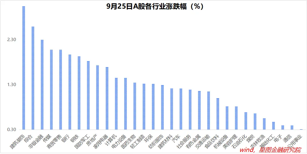 行业层面,全部行业均录得上涨。其中,建筑装饰(3.06%)、非银金融(2.3%)、传媒、商贸零售等板块涨幅靠前;公用事业、通信、电子、基础化工等涨幅靠后,均低于0.5个百分点。