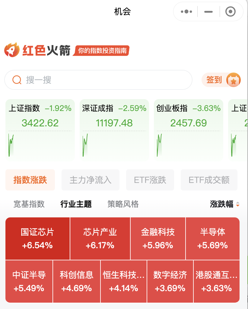 使用方式很简单,用微信小程序直接搜索“红色火箭”就可以了,打开首页就能看到当天的涨跌以及资金排行情况。
