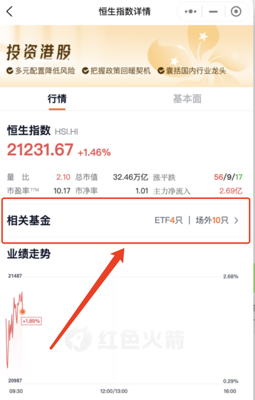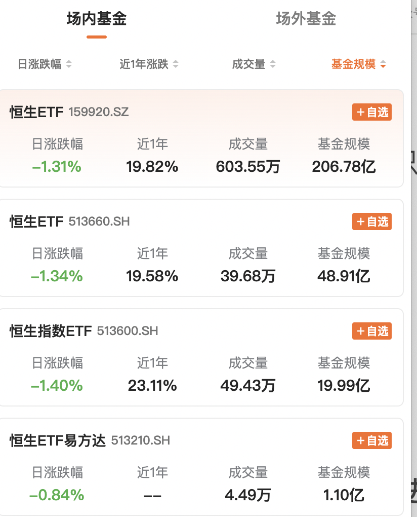 点进“相关基金”菜单后,就能看到恒生指数对应的4只场内ETF和10只场外基金,一般情况下首选成交量最大的品种,因为它的流动性最好。