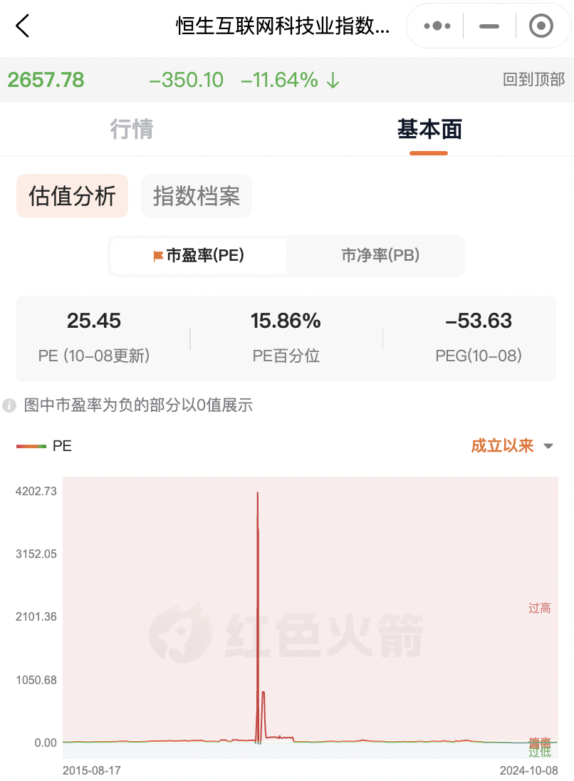 如果看这两天回调最猛的恒生,尤其是大家最为关注的恒生科技指数,那更是叫一个惨不忍睹,当下25.45的PE也就是处在历史15.86%的区间里,换句话说就是,过去历史中有超84%的时间估值都比现在高。