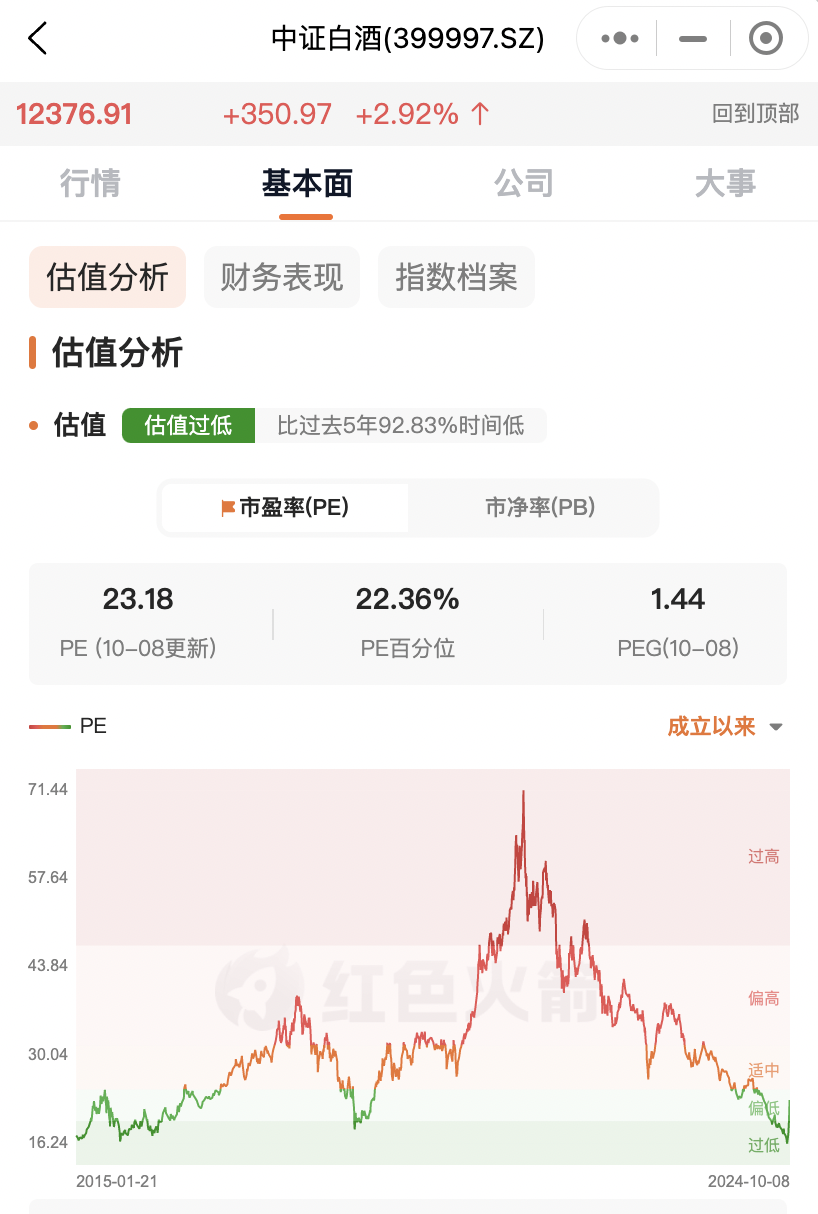 其实即便狂涨这么些天,现在市场也处于绝对低估的位置,我们看下图的几大核心指数估值百分位情况(这里都选取回调前10月8号的估值),中证白酒截至10月8号收盘整体PE才23倍,处于比过去五年92.83%的时间都低的时候,即便放大到10年纬度看,现在的估值也就是过去十年22.36%的PE百分位。