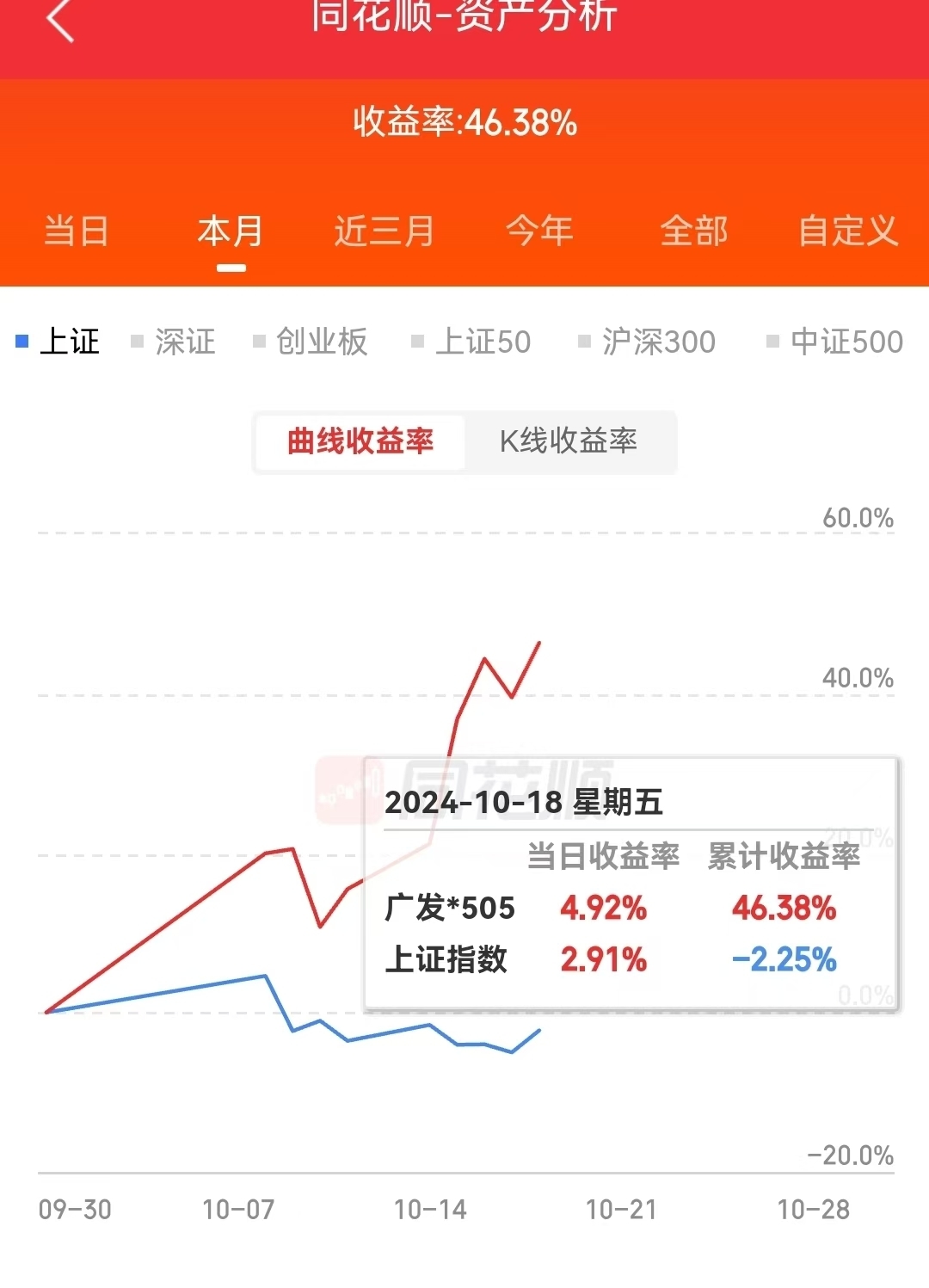 10月份,由于小长假的影响,从10月8号才开始。再过去的这9个交易日了,老赵完成了46.38%的盈利,不出意外的话,周一突破50%是大概率事件。