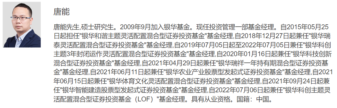 除了银华科创主题灵活配置混合(LOF),基金经理唐能管理的其他产品近期表现也同样出色。其中,银华科技创新混合近1月回报超40%,银华体育文化灵活配置混合A、银华瑞祥一年持有期混合、银华瑞泰灵活配置混合等4只产品近1月回报超30%。