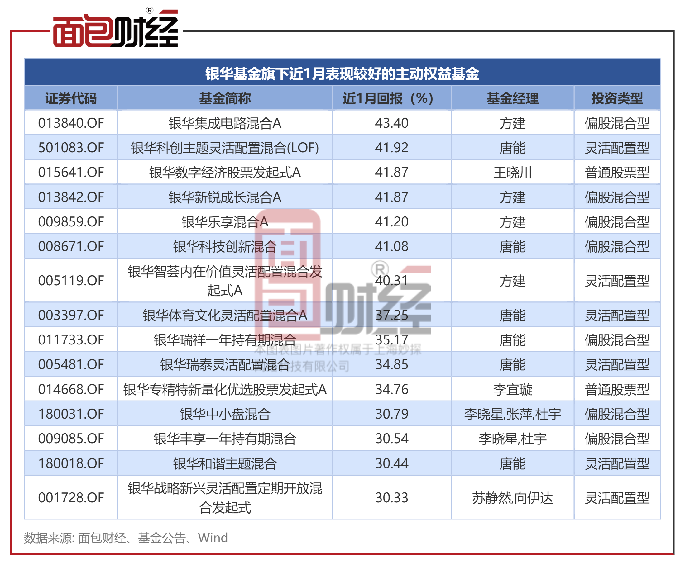数据显示,银华基金旗下15只主动权益基金近1个月净值上涨超过30%,包括银华集成电路混合A、银华科创主题灵活配置混合(LOF)等产品。