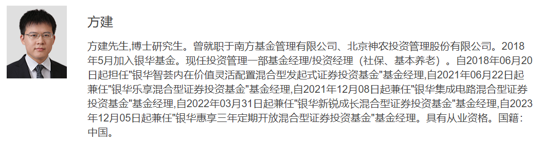 银华集成电路混合A的基金经理为方建,2018年5月加入银华基金。现任投资管理一部基金经理/投资经理(社保、基本养老)。