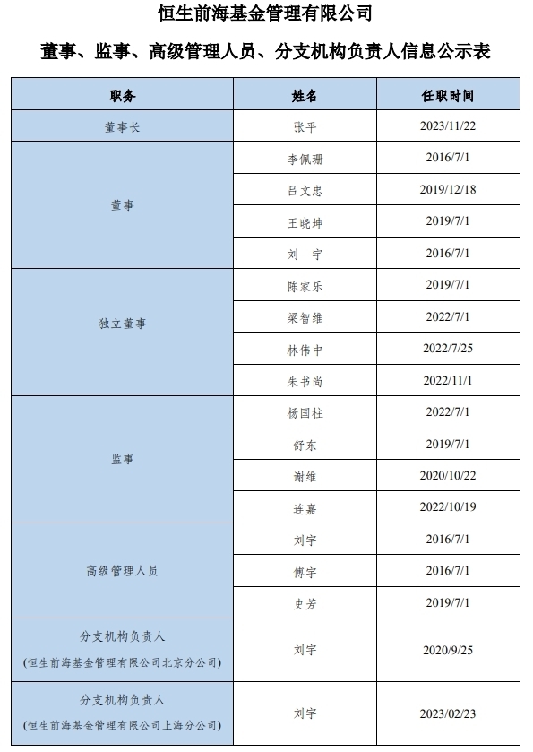 公开披露的信息显示,恒生前海基金基金董事长为张平,总经理为刘宇,督察长为傅宇。