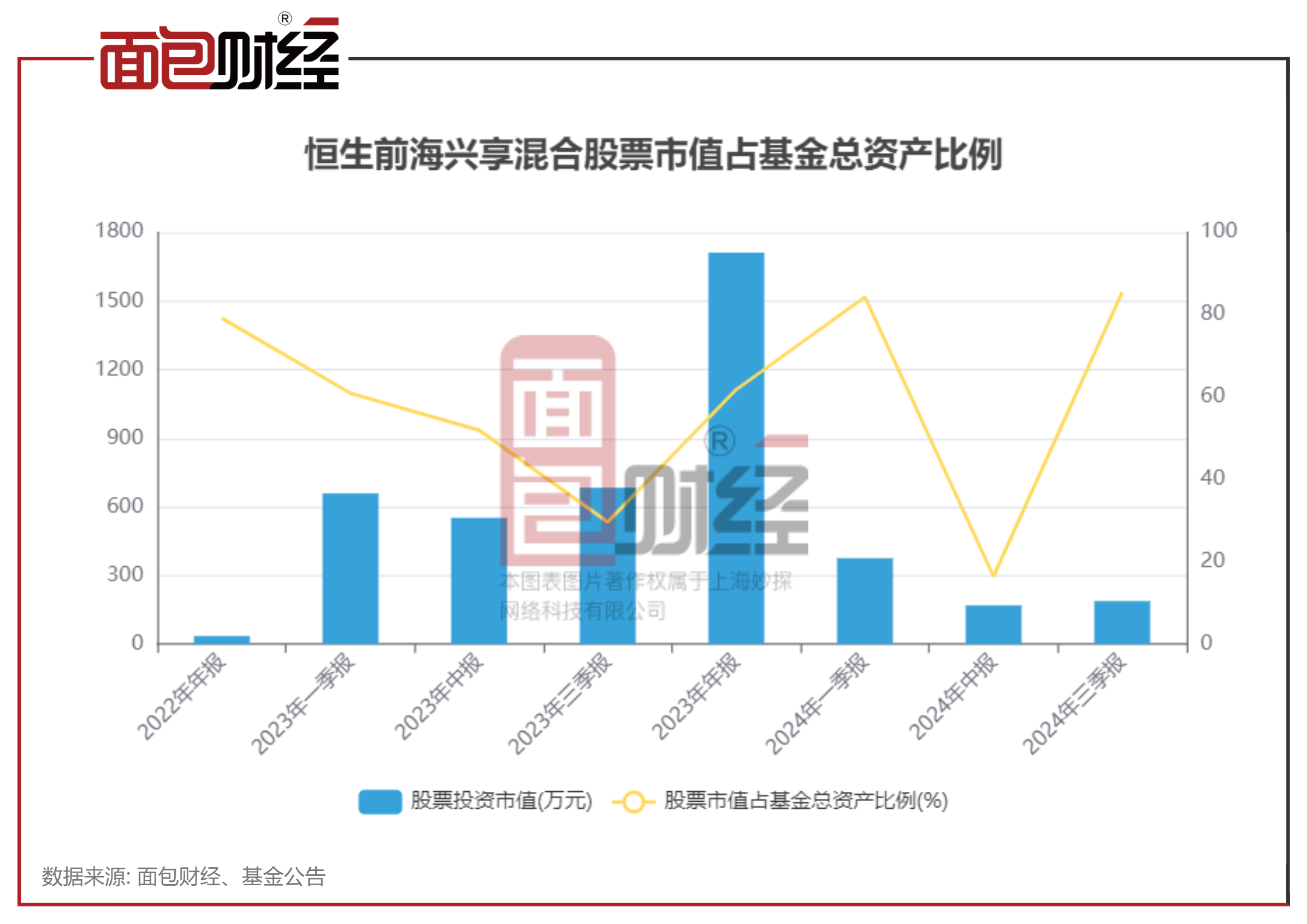 在资产配置方面,恒生前海兴享混合误判市场,二季度股票仓位从84.27%降至16.48%。2024年三季度末,恒生前海兴享混合又将股票仓位加到85.49%。