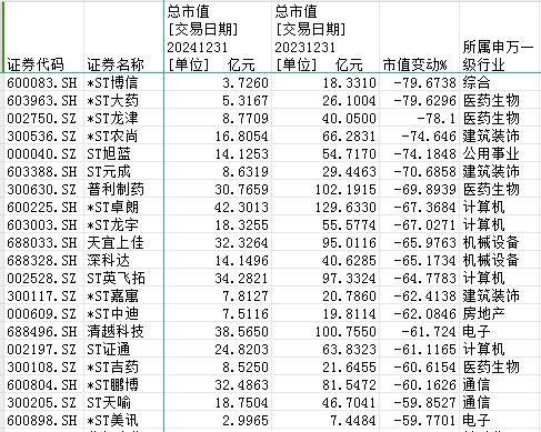 在A股股票市值降幅Top20上市公司中,*ST博信、*ST大药、*ST龙津、*ST农尚、ST旭蓝、ST元成6家上市公司降幅超过70%;普利制药、*ST卓朗、*ST龙宇、天宜上佳、深科达、ST英飞拓、*ST嘉寓、*ST中迪、清越科技、ST证通、*ST吉药、*ST鹏博12家上市公司降幅位于60-70%。