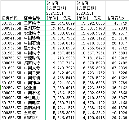 此外,中国银行、中国神华、比亚迪、中国电信、中国平安5家上市公司总市值涨幅超过30%;邮储银行、长江电力、中国石油、中国移动、中国石化5家公司涨幅超过20%。
