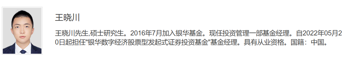 银华数字经济股票发起式A现任基金经理为王晓川,2016年7月加入银华基金,历任交通运输、煤炭、传媒行业研究员,投资管理一部投资经理助理,现任投资管理一部基金经理。自2022年5月20日担任银华数字经济股票型发起式证券投资基金基金经理。