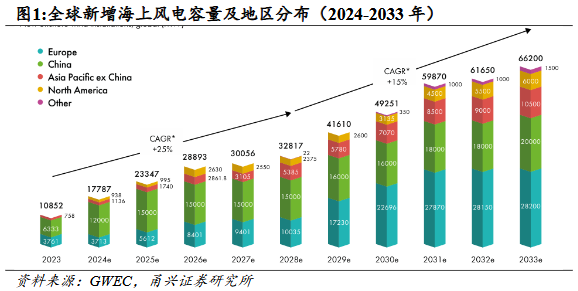 GWEC预计,2024年至2030年全球将新增超410GW海上风电装机容量,年均复合增速达到20%;到2030年全球海上风电装机总容量将达到486GW。
