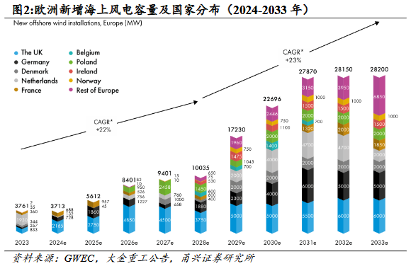 欧洲是海上风电的主要增长引擎,2024年至2030年欧洲风电总装机将增加260GW,平均每年增加37GW,其中2025年新增装机5.6GW,同比增速超过51%;每年海上风电新增装机量将由2023年的3.8GW增长至2030年的31.4GW,年均复苏增速将达到35.2%。