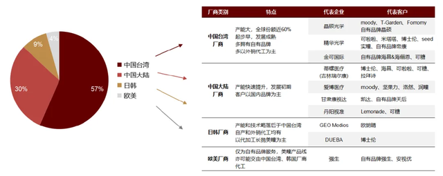 注:品牌销售排名参考天猫平台2023各美瞳品牌销售额数据计算;饼图中的各地区生产商占比是由Top20美瞳品牌对应生产商的数量占比计算得出