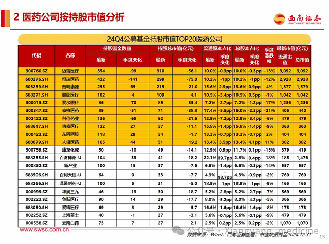 在2024Q4公募持仓市值Top20医药企业中竟然出现了爱博医疗,请注意,所长这里用的是“竟然”这个词,为啥呢?因为排在爱博前面的企业市值都比爱博大得多,都是市场耳熟能详的“大白马”,他们的市值本来就大,公募持仓总金额大也是理所应当,而爱博凭借100多亿的市值还能让机构持仓金额靠前,那是真的不容易。