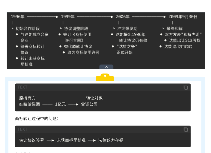 但其实真实的历史是这样的,1996年,娃哈哈集团与达能签署合资协议,成立杭州娃哈哈食品有限公司,双方签署商标转让协议,计划将"娃哈哈"商标转让给合资公司,但该商标转让未获国家工商总局商标局核准,也就是说不存在转让商标的问题,不存在商标属于食品公司的说法。1999年,双方重新协商,签订《商标使用许可合同》,这份合同替代了原先的转让协议,改为将商标许可给合资公司使用。后来,达娃大战结束后,商标继续在集团公司,食品公司使用商标,而公开渠道从未看到食品公司给集团公司缴纳了多少使用费。
