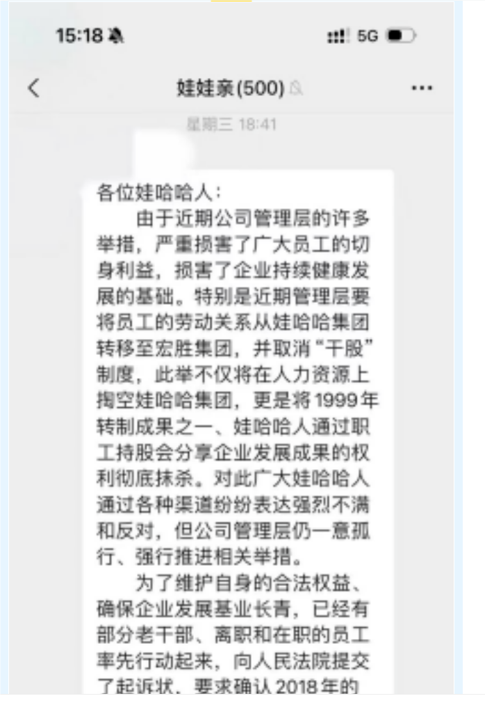 由于近期公司管理层的许多举措,严重损害了广大员工的切身利益,损害了企业持续健康发展的基础。特别是近期管理层要将员工的劳动关系从娃哈哈集团转移至宏胜集团,并取消干股制度,此举不仅将在人力资源上掏空娃哈哈集团,更是将1999年转制成果之一、娃哈哈人通过职工持股会分享企业发展成果的权利彻底抹杀。