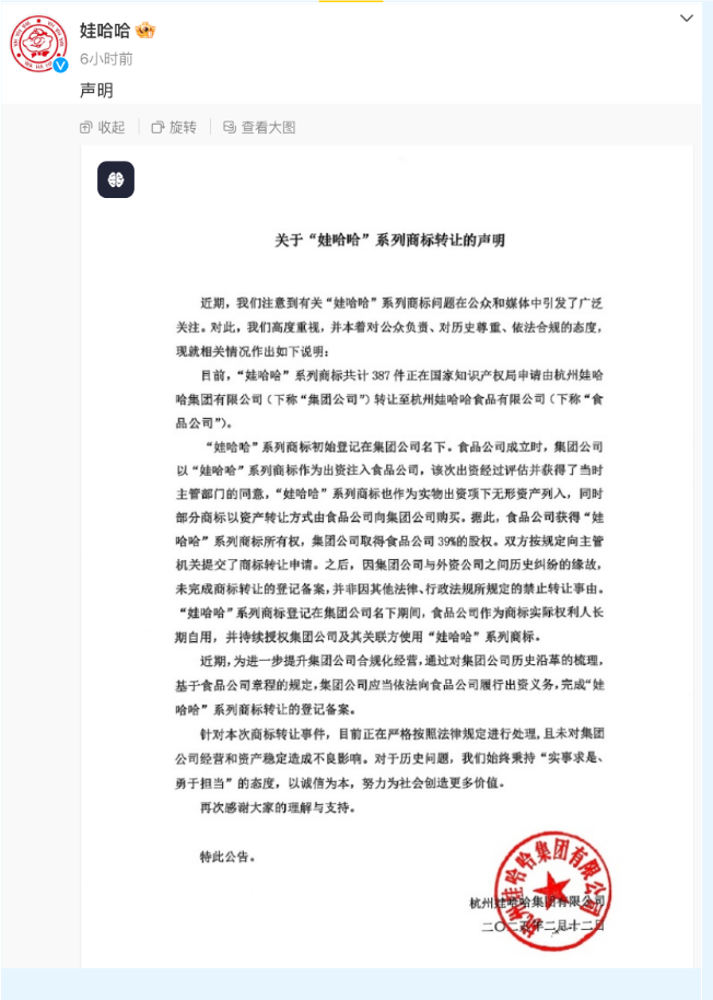 针对市场对于娃哈哈商标转让的风波,娃哈哈官方微博发布了关于”娃哈哈“系列商标转让的声明。但这个声明其实刚好证明娃哈哈商标目前还是属于娃哈哈集团的,从未转让成功,因此,现在娃哈哈试图把商标从国资娃哈哈转给宗馥莉的娃哈哈的私相授受可能存在法律问题。