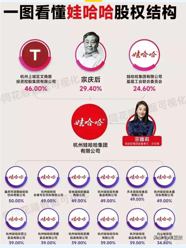 因为很简单,虽然董事长都是宗庆后之女宗馥莉,但娃哈哈集团公司是国企控股(杭州上城区政府是第一大股东),食品公司是宗馥莉个人控股。目前娃哈哈商标的价值约为 900 亿,作为大股东的杭州上城区国资名义上拥有 412 亿的权益。