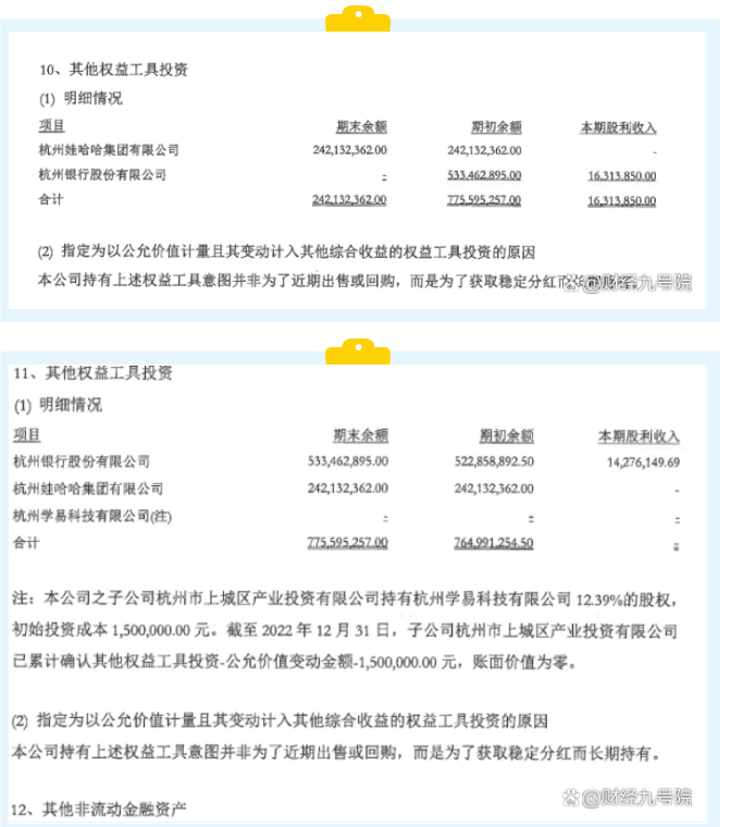 和商标相关的同样的问题是,娃哈哈的国资股东从未得到股东的基本权利:同股同权。目前可以查到的杭州上城区文旅的2022年、2023年审计报告,国资获得的分红为 0。同样作为股东,上城区文旅从杭州银行分得的红利每年超过 1 个亿。