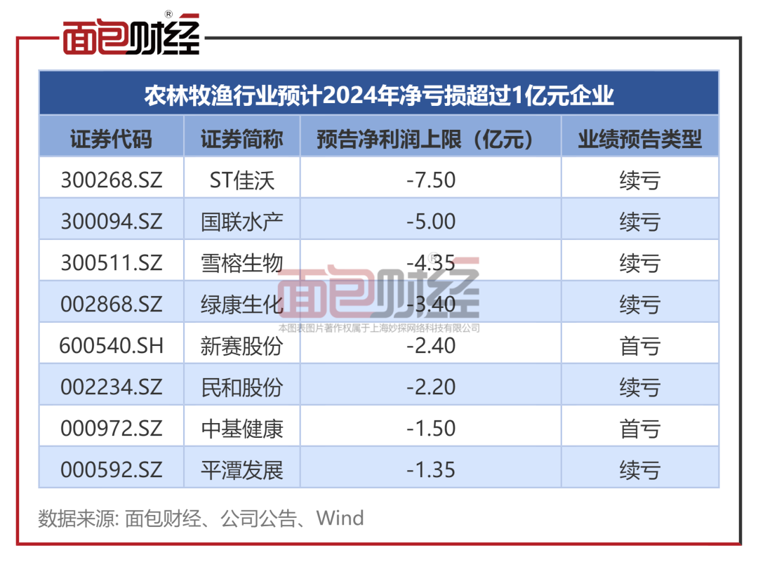 ST佳沃、国联水产预告2024年净利润上限亏损达到或超过5亿元。此外,雪榕生物、绿康生化、新赛股份等25家公司出现亏损。