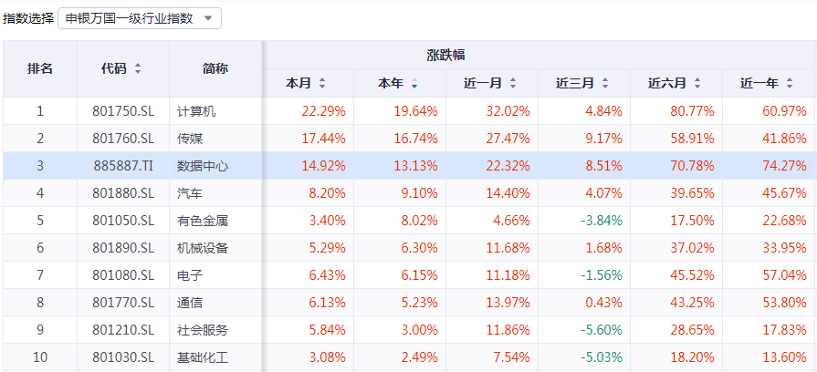从整体市场表现看,同花顺数据显示,数据中心指数在本月、本年、近一月区间涨幅表现均位于申万一级行业指数第三名;近三月、近六月区间涨幅表现均位于申万一级行业指数第二名;近一年区间涨幅则位于第一,高达74.27%。