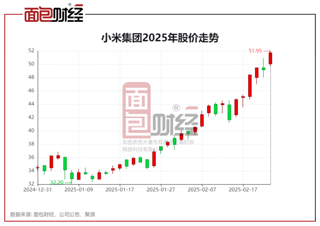 2025年以来,小米上涨49.86%,市值约1.30万亿港元。