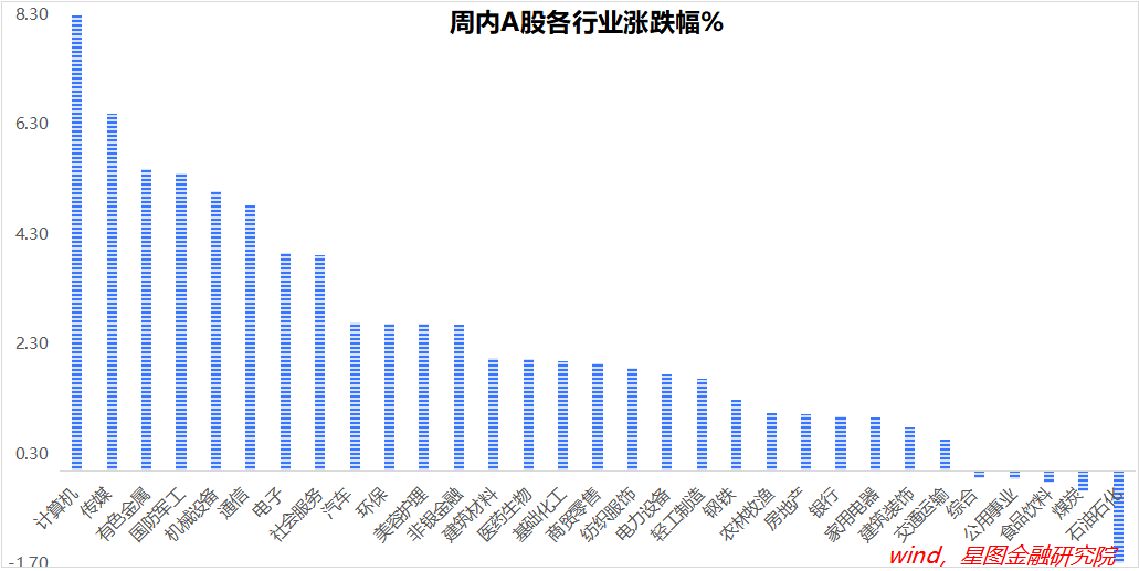周内来看,计算机(8.28%)、传媒(6.49%)、有色金属、国防军工、机械设备涨幅均超过5%;石油石化(-1.7%)、煤炭(-0.38%)、食品饮料、公用事业等逆势收跌。