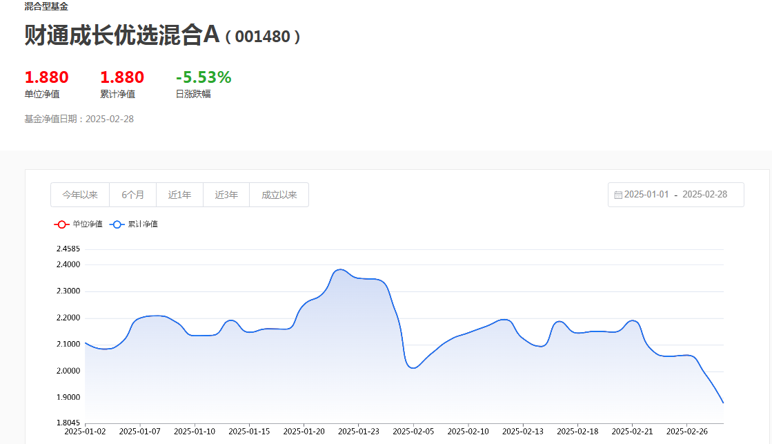 财通成长优选混合成立于2015年6月29日,基金经理为金梓才,最新报告期披露基金规模超过20亿元。2025年2月,该基金A份额净值下跌达到15.66%。