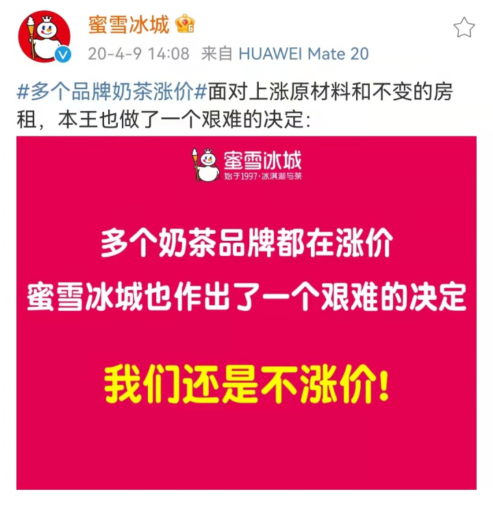 新冠疫情爆发后,面对原材料价格上涨,许多奶茶品牌都在涨价,而蜜雪冰城却在官方微博上发布了一个艰难的决定:
