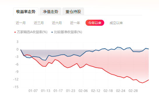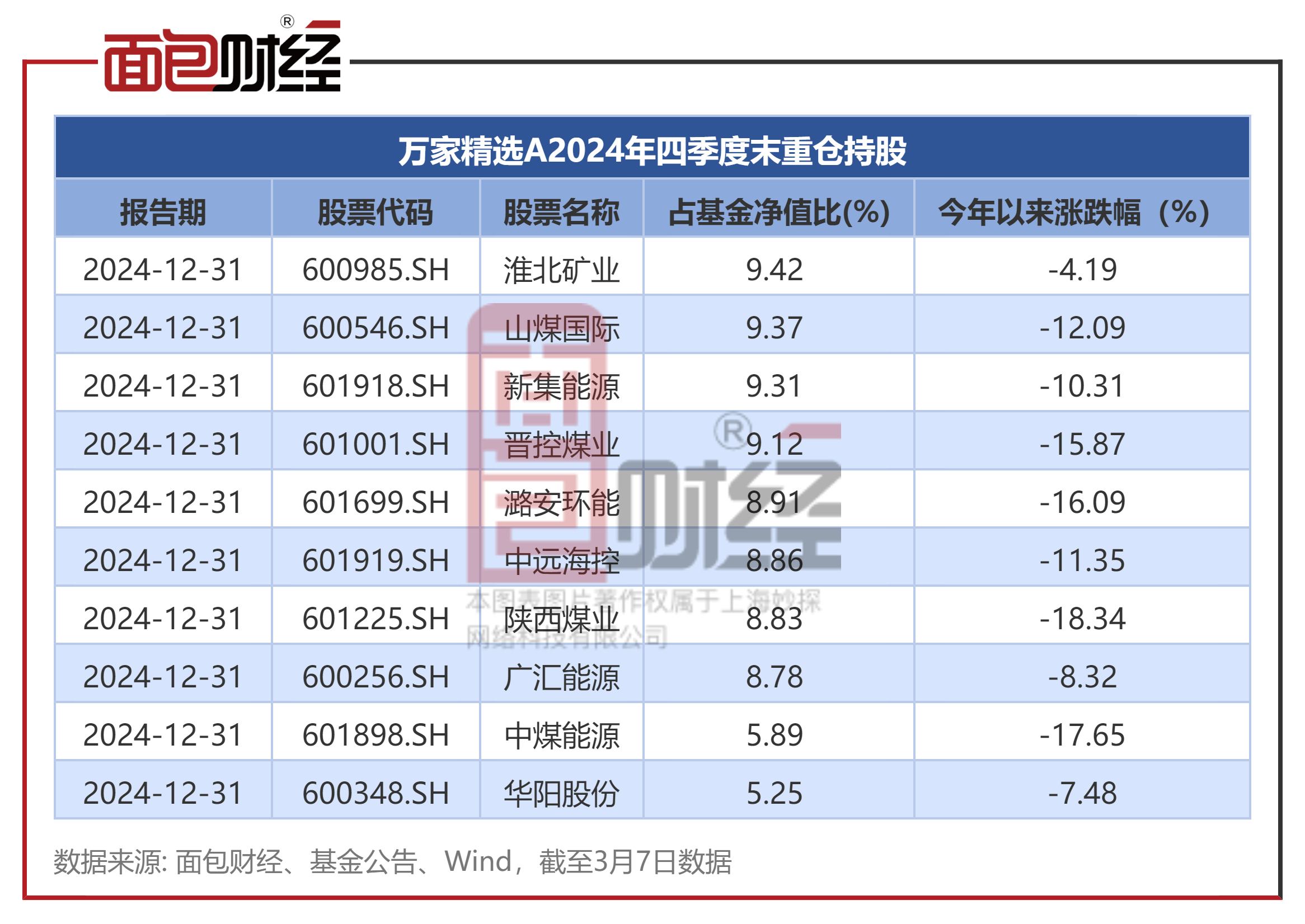 2025年以来,中证煤炭指数年内跌幅超过10%。截至3月7日,万家精选前十大重仓股年内悉数下跌,其中7只个股跌幅超过10%。