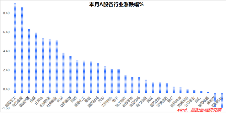 月内来看,国防军工(9.5%)、有色金属、美容护理、传媒等涨幅均超6%;石油石化(-1.56%)、房地产、家用电器、综合、公用事业等涨幅靠后。
