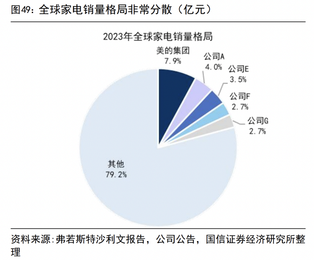 从这点也可以看出美的这家企业的文化,整体是非常开放包容且善于学习的。因此,相比格力这么些年始终只有空调能打,不论怎么搞多元化都以失败告终,出海做得也很一般,美的不仅在空调领域做到后来居上,还搞出了冰箱、洗衣机、厨电、小家电等一大堆C端家电产品,而且几乎所有家电品类按销量市占率看都是全球前三,整体来看,美的已然是全球最大的家电企业。